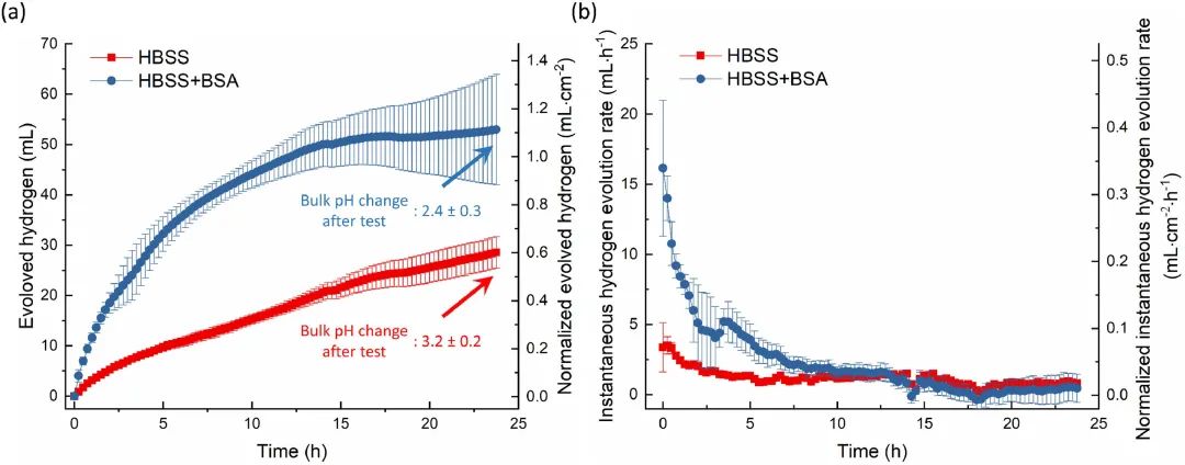 圖1 (a) CP Mg在HBSS和HBSS+BSA中浸泡24小時的析氫曲線,(b)依據(jù)(a)計算的瞬時析氫速率