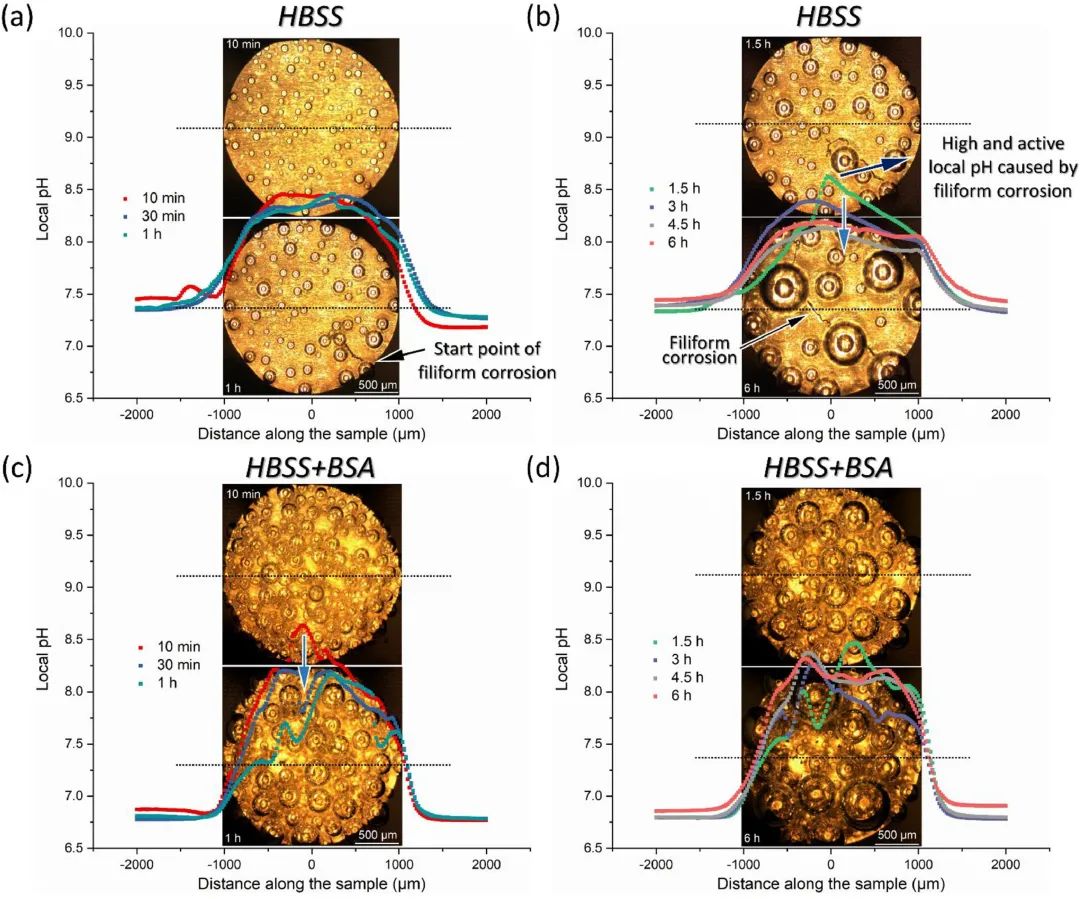 圖2 浸入(a, b) HBSS中的CP Mg表面50 μm處的局部pH測量(線掃描),(c, d) 浸入過程中的HBSS+BSA中的CP Mg表面50 μm處的局部 pH測量(線掃描)。所有測量均在流體動力學條件下進行,流速為1.0 mL/min。光學顯微照片顯示了測試過程中兩個樣品的視覺外觀