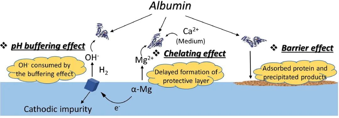 最近,來自德國亥姆霍茲聯(lián)合會吉斯達赫特材料及海岸研究中心的梅迪博士(現(xiàn)為鄭州大學講師)、Sviatlana Lamaka博士與Mikhail Zheludkevich教授等人綜合運用析氫測試、失重測試、微區(qū)pH監(jiān)控、原位連續(xù)阻抗監(jiān)控等手段研究了純鎂在含牛血清白蛋白(BSA)的Hank’s平衡鹽溶液(HBSS)中的腐蝕行為,重點探討了白蛋白對純鎂腐蝕行為的影響機制。結(jié)果發(fā)現(xiàn),白蛋白對鎂腐蝕行為的影響主要包含吸附作用、Ca2+/Mg2+絡(luò)合作用和pH緩沖作用等三種機制。這項工作加深了對復(fù)雜偽生理環(huán)境中鎂腐蝕降解行為的理解。