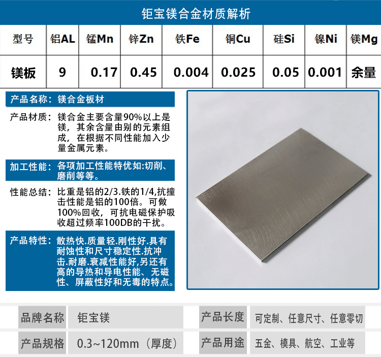 東莞市鉅寶鎂合金材料有限公司是一家專業(yè)從事鎂合金系列產(chǎn)品的研發(fā)、生產(chǎn)、銷售為一體的企業(yè),多年來,在同行業(yè)和消費(fèi)者的心中了贏得非常值得信賴的口碑,本司主要產(chǎn)品有:鎂合金板、鎂合金管、鎂合金棒、鎂合金型材、鎂豆、鎂絲、蝕刻板、雕刻板、及鎂合金機(jī)加工產(chǎn)品,主要應(yīng)用于:航天、軍工、軌道、交通、新能源汽車、智能制造、3C等各種領(lǐng)域,我司的產(chǎn)品暢銷美、歐、日、韓等各國,另外我司還通過了ISO9001:2015國際質(zhì)量管理體系認(rèn)證,擁有規(guī)范和完善的質(zhì)量體系,公司秉承“誠信、專業(yè)、共贏”的經(jīng)營理念,堅持用戶至上,以優(yōu)質(zhì)的服務(wù)來服務(wù)好每一位客戶,堅持技術(shù)上不斷創(chuàng)新、不斷超越,用我們的優(yōu)質(zhì)服務(wù)以及專業(yè)技術(shù)為客戶提供產(chǎn)品的后續(xù)表面處理及售后服務(wù)。